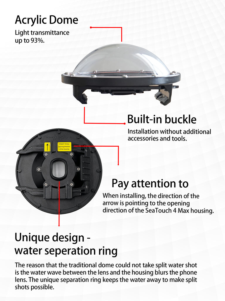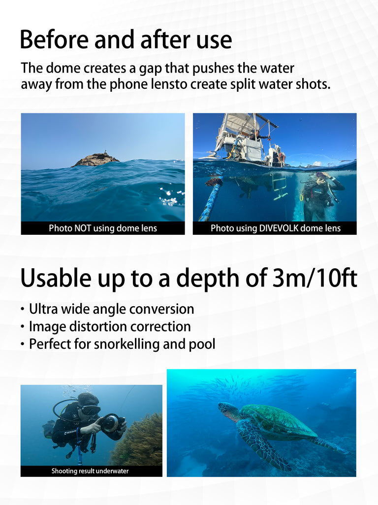 ABOVE AND UNDER WATER SHOOTING: This dome lens can be used to capture above and under water photos by moving the waterline away from the lens,gives you more choices to record stunning moments